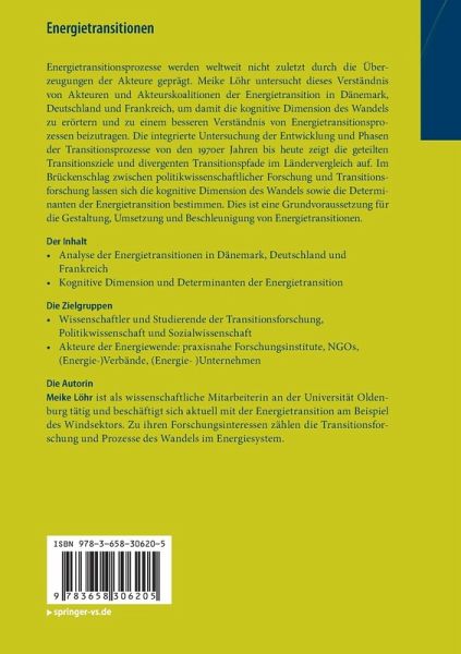 Energietransitionsprozesse werden weltweit nicht zuletzt durch die Überzeugungen der Akteure geprägt. Meike Löhr untersucht dieses Verständnis von Akteuren und Akteurskoalitionen der Energietransition in Dänemark, Deutschland und Frankreich, um damit die kognitive Dimension des Wandels zu erörtern und zu einem besseren Verständnis von Energietransitionsprozessen beizutragen. Die integrierte Untersuchung der Entwicklung und Phasen der Transitionsprozesse von den 1970er Jahren bis heute zeigt die geteilten Transitionsziele und divergenten Transitionspfade im Ländervergleich auf. Im Brückenschlag zwischen politikwissenschaftlicher Forschung und Transitionsforschung lassen sich die kognitive Dimension des Wandels sowie die Determinanten der Energietransition bestimmen. Dies ist eine Grundvoraussetzung für die Gestaltung, Umsetzung und Beschleunigung von Energietransitionen.