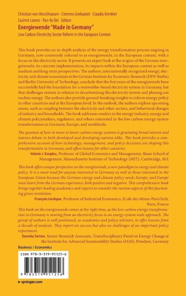 1 Introduction: The German Energiewende in the European Context.- Part I: The Historical Origins and Emergence of the Energiewende.- 2 German Energy and Climate Policies: A Historical Overview.- 3 The Transformation of the German Coal Sector from 1950 to 2017 - A Historical Overview.- Part II: The Energiewende at Work in the Electricity Sector.- 4 Greenhouse Gas Emission Reduction and the Phasing-our of Coal in Germany.- 5 Nuclear Power: Effects of Plant Closures on Electricity Markets and Remaining Challenges.- 6 Renewable Energy Sources as the Cornerstone of the German Energiewende.- 7 Energy Efficiency: A Key Challenge of the Energiewende.- 8 The Role of Electricity Transmission Infrastructure.- 9 Sector Coupling for an Integrated Low Carbon Energy Transformation - A Techno-Economic Introduction and Application to Germany.- 10 The Electricity Mix in the European Low Carbon Transformation: Coal, Nuclear, and Renewables.- 11 Energy Infrastructures for the Low Carbon Transformation in Europe,- Part III: The German Energiewende in the Context of the Europe Low Carbon Transformation.- 12 Cross-Border Cooperation in the European Context: Evidence from Regional Cooperation Initiatives.- 13 Modeling the Low Carbon Transformation in Europe and Germany: Developing Paths for the European Energy System until 2050.- Part IV: Assessment, Perspectives, and Conclusions.- 14 General Conclusions: Fifteen Lessons from the First Phase of the Energiewende.