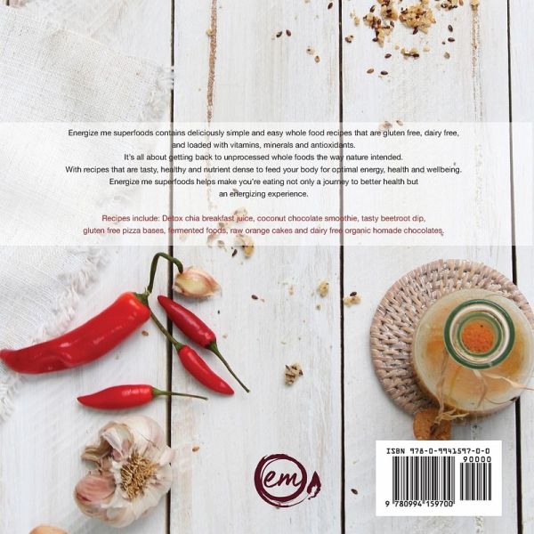 Energize Me Superfoods contains deliciously simple and easy whole food recipes that are gluten free, dairy free and loaded with vitamins, minerals and antioxidants. It's about getting back to unprocessed whole foods the way nature intended. With recipes that are tasty, healthy and nutrient dense to feed your body for optimal energy, health and wellbeing. Energize Me superfoods helps make you're eating not only a journey to better health but an energizing experience. You will not have to worry about counting calories, or going on a fad diets ever again. Energize Me Superfoods contains many peoples favorite meals such as, pancakes, muffins, lasagna, pizza and chocolate mouse all with a healthy twist. Recipes include: detox chia breakfast juice, coconut chocolate smoothie, tasty beetroot dip, gluten free pizza, fermented foods, raw orange cakes and simple dairy free organic homemade chocolate.
