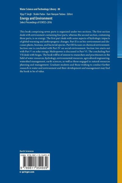This book comprising seven parts is organized under two sections. The first section deals with environment containing four parts, whereas the second section, containing three parts, is on energy. The first part deals with some aspects of hydrologic impacts of global warming and anthropogenic changes. Part II is on bio-environment and discusses plants, biomass, and bacterial species. Part III focuses on chemical environment. Section one is concluded with Part IV on social environment. Section two starts out with Part V on solar energy. Hydropower is discussed in Part VI. The concluding Part VII deals with biogas. The book will be of interest to researchers and practitioners in the field of water resources, hydrology, environmental resources, agricultural engineering, watershed management, earth sciences, as well as those engaged in natural resources planning and management. Graduate students and those wishing to conduct further research in water and environment and their development and management may find the book to be of value.
