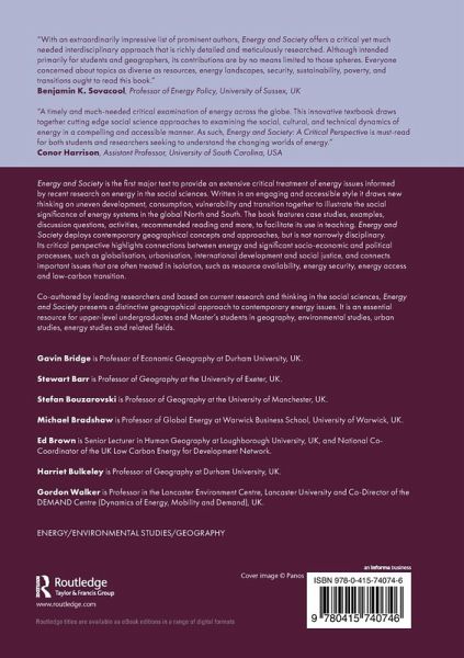 List of Figures List of Tables List of Definitions Introduction: a critical perspective on energy-society relations PART 1 ENERGY, SPACES AND FLOWS Chapter 1 Resource landscapes Chapter 2 Economic landscapes Chapter 3 Infrastructural landscapes Chapter 4 Geopolitical landscapes PART 2 SECURITIES, VULNERABILITIES AND JUSTICE Chapter 5 Energy poverty and vulnerability Chapter 6 Energy consumption, inefficiency and excess Chapter 7 Energy controversies and conflicts Chapter 8 Energy securities PART 3 TRANSITIONS, GOVERNANCE AND FUTURES Chapter 9 Past transitions Chapter 10 Future transitions Index