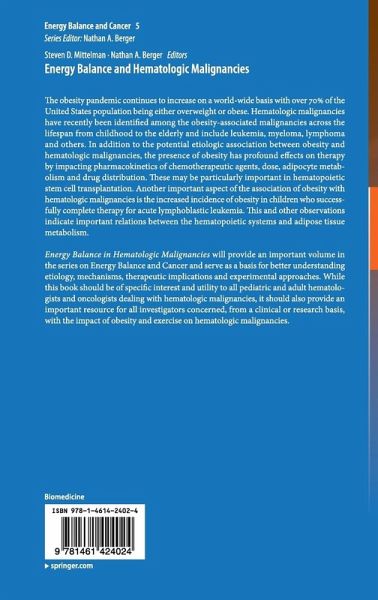 The obesity pandemic continues to increase on a world-wide basis with over 70% of the United States population being either overweight or obese. Hematologic malignancies have recently been identified among the obesity associated malignancies spanning the lifespan from childhood to the elderly and include leukemia, myeloma, lymphoma and others. In addition to the etiologic association between obesity and hematologic malignancies, the presence of obesity has profound effects on therapy by impacting pharmacokinetics of chemotherapeutic agents, dose, adipocyte metabolism and drug distribution. These may be particularly important in hematopoietic stem cell transplantation. Another important aspect of the association of obesity with hematologic malignancies is the increased incidence of obesity in children who successfully complete therapy for acute lymphoblastic leukemia. This and other observations indicate important relations between the hematopoietic systems and fat metabolism. This volume on Energy Balance in Hematologic Malignancies will provide an important volume in this series and a basis for better understanding etiology, mechanisms, therapeutics implications and experimental approaches. This volume of energy balance and cancer will focus on the relation of obesity to hematologic malignancies, the epidemiology, potential mechanisms, and thereapeutic considerations including effects on pharmacologic and physical approaches as well as the delayed effects of therapy on energy balance.