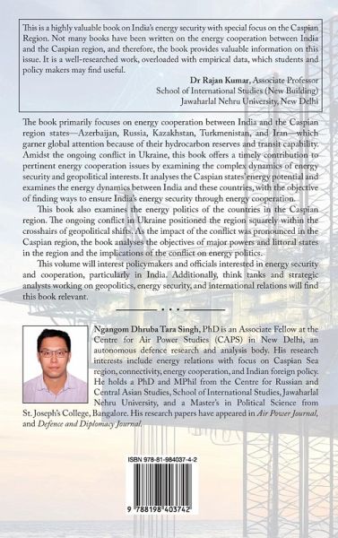 The book primarily focuses on energy cooperation between India and the Caspian region states-Azerbaijan, Russia, Kazakhstan, Turkmenistan, and Iran-which garner global attention because of their hydrocarbon reserves and transit capability. Amidst the ongoing conflict in Ukraine, this book offers a timely contribution to pertinent energy cooperation issues by examining the complex dynamics of energy security and geopolitical interests. It analyses the Caspian states' energy potential and examines the energy dynamics between India and these countries, with the objective of finding ways to ensure India's energy security through energy cooperation. This book also examines the energy politics of the countries in the Caspian region. The ongoing conflict in Ukraine positioned the region squarely within the crosshairs of geopolitical shifts. As the impact of the conflict was pronounced in the Caspian region, the book analyses the objectives of major powers and littoral states in the region and the implications of the conflict on energy politics.This volume will interest policymakers and officials interested in energy security and cooperation, particularly in India. Additionally, think tanks and strategic analysts working on geopolitics, energy security, and international relations will find this book relevant.Ngangom Dhruba Tara Singh , PhD is an Associate Fellow at the Centre for Air Power Studies (CAPS) in New Delhi, an autonomous defence research and analysis body. His research interests include energy relations with focus on Caspian Sea region, connectivity, energy cooperation, and Indian foreign policy. He holds a PhD and MPhil from the Centre for Russian and Central Asian Studies, School of International Studies, Jawaharlal Nehru University, and a Master's in Political Science from St. Joseph's College, Bangalore. His research papers have appeared in Air Power Journal, and Defence and Diplomacy Journal.