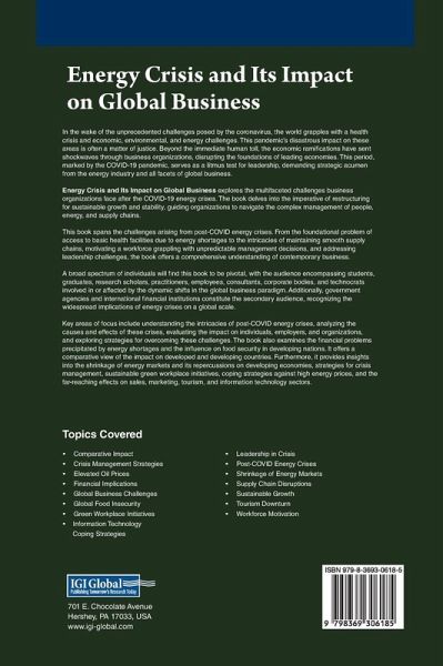 In the wake of the unprecedented challenges posed by the coronavirus, the world grapples with a health crisis and economic, environmental, and energy challenges. This pandemic's disastrous impact on these areas is often a matter of justice. Beyond the immediate human toll, the economic ramifications have sent shockwaves through business organizations, disrupting the foundations of leading economies. This period, marked by the COVID-19 pandemic, serves as a litmus test for leadership, demanding strategic acumen from the energy industry and all facets of global business. Energy Crisis and Its Impact on Global Business explores the multifaceted challenges business organizations face after the COVID-19 energy crises. The book delves into the imperative of restructuring for sustainable growth and stability, guiding organizations to navigate the complex management of people, energy, and supply chains. This book spans the challenges arising from post-COVID energy crises. From the foundational problem of access to basic health facilities due to energy shortages to the intricacies of maintaining smooth supply chains, motivating a workforce grappling with unpredictable management decisions, and addressing leadership challenges, the book offers a comprehensive understanding of contemporary business. A broad spectrum of individuals will find this book to be pivotal, with the audience encompassing students, graduates, research scholars, practitioners, employees, consultants, corporate bodies, and technocrats involved in or affected by the dynamic shifts in the global business paradigm.