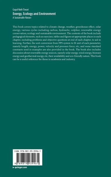 This book covers topics related to climate change, weather, greenhouse effect, solar energy, various cycles including carbon, hydraulic, sulphur, renewable energy conservation, ecology and sustainable environment. The contents of the book include pedagogical elements, such as exercises, tables and figures at appropriate places in each chapter, including problems and objective questions at end of each chapter, to aid in learning. Further, the unit conversion from FPS system to SI unit of each parameter, namely length, energy, power, velocity and pressure force, etc, and some standard constants used in examples are also provided in the book. The book also includes discussion about renewable energy sources, namely solar energy, wind energy, biomass energy and geothermal energy, etc, their availability and eco-friendly nature. This book can be a useful reference for those in academia and industry.
