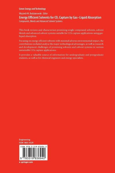 Introduction to Carbon Dioxide Capture by Gas-liquid Absorption in Nature, Industry, and Perspectives for the Energy Sector and Beyond.- Assessment of Thermodynamic Efficiency of Carbon Dioxide Separation in Capture Plants by Using Gas-liquid Absorption.- Process Implications of CO2 Capture Solvent Selection.- Useful Mechanisms, Energy Efficiency Benefits, and Challenges of Emerging Innovative Advanced Solvent Based Capture Processes.- Phase Change Solvents for CO2 Capture Applications.- Aqueous Amino Acid Salts and Their Blends as Efficient Absorbents for CO2 Capture.- Ionic Liquids: Advanced Solvents for CO2 Capture.- Amine-blends Screening and Characterization for CO2 Post-combustion Capture.- Post-combustion Carbon Dioxide Capture with Aqueous (Piperazine + 2-amino-2methyl-1-propanol) Blended Solvent: Performance Evaluation and Analysis of Energy Requirements.- Energy Efficient Absorbents for Industry Promising Carbon Dioxide Capture.- The AbsorptionKinetics of CO2 into Ionic Liquid- CO2 Binding Organic Liquid and Hybrid Solvents.- Solubility of Carbon Dioxide in Aqueous Solutions of Linear Polyamines.