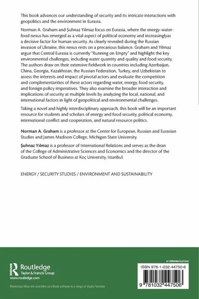 Norman A. Graham and Suhnaz Yilmaz focus on Eurasia, where the energy-water-food nexus has emerged as a vital aspect of political economy and increasinglyas a decisive factor for human security. As clearly revealed during the Russian invasion of Ukraine, this nexus rests on a precarious balance. Graham and Yilmaz argue that Central Eurasia is currently "Running on Empty" and highlight the key environmental challenges, including water quantity and quality and food security. The authors draw on their extensive fieldwork in countries including Azerbaijan, China, Georgia, Kazakhstan, the Russian Federation, Turkey, and Uzbekistan to assess the interests and impact of pivotal actors and evaluate the competition and complementarities of these actors regarding water, energy, food security, and foreign policy imperatives. They also examine the broader interaction and implications of security at multiple levels by analyzing the local, national, and international factors in light of geopolitical and environmental challenges.
