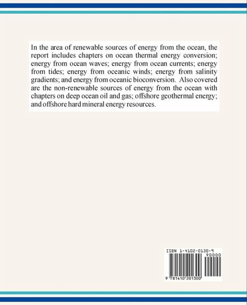 In the area of renewable sources of energy from the ocean, the report includes chapters on ocean thermal energy conversion; energy from ocean waves; energy from ocean currents; energy from tides; energy from oceanic winds; energy from salinity gradients; and energy from oceanic bioconversion. Also covered are the non-renewable sources of energy from the ocean with chapters on deep ocean oil and gas; offshore geothermal energy; and offshore hard mineral energy resources.