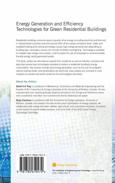 * Chapter 1: Introduction and motivation * Chapter 2: Clean energy generation in residential green buildings * Chapter 3: Performance monitoring of a 60 kW photovoltaic array in Alberta * Chapter 4: Environmental and economic evaluation of PV solar system for remote communities using building information modeling: A case study * Chapter 5: Solar energy generation technology for small homes * Chapter 6: Numerical analysis of phase change materials for use in energy-efficient buildings * Chapter 7: Insulation materials * Chapter 8: Latent relationships between construction cost and energy efficiency in multifamily green buildings * Chapter 9: Secondary battery technologies: a static potential for power * Chapter 10: A critical review with solar radiation analysis model on inclined and horizontal surfaces * Chapter 11: Nature-based building solutions: circular utilization of photosynthetic organisms