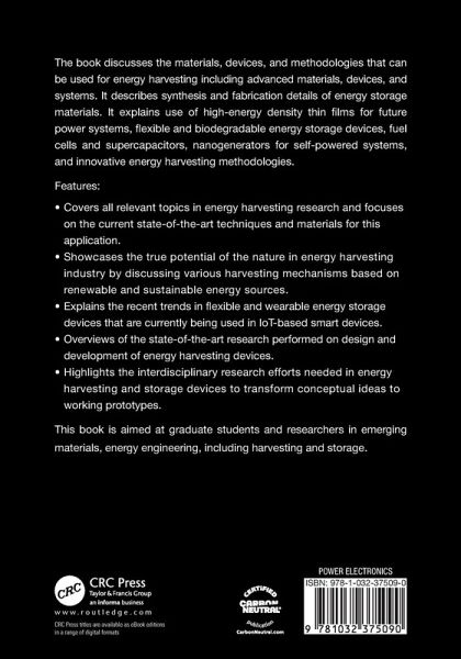 The book discusses the materials, devices and methodologies that can be used for energy harvesting including advanced materials. It describes synthesis and fabrication of energy storage materials, developments in organic/inorganic, and flexible solar cells, usage of high energy density thin films for future power systems, and so forth.
