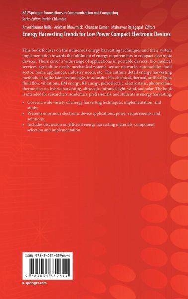 Introduction.- Energy harvesting techniques and trends in applications.- Material and components selection for efficient energy harvesting.- RF and millimeter wave energy harvesting techniques and applications.- Energy harvesting systems for agriculture needs.- Acoustic signal energy harvesting techniques and relevant systems.- Bio-medical devices adopting energy harvesting schemes.- Wireless sensor networks, smart electronic gadget energy needs and energy harvesting systems.- Piezo energy harvesting and application prospects.- Energy harvesting systems for military, space and defence applications.- Mechanical energy harvesting scheme and implementation aspects, applications.- Fluid based energy harvesting systems for electronic appliances.- Energy harvesting schemes for home appliances, vehicles, chargers.- Light energy harvesting systems and applications.- Thermal energy harvesting prospects, systems and applications.- Conclusion.