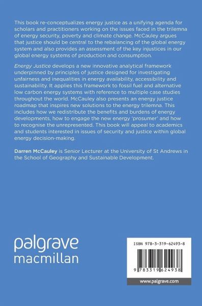 Energy Justice develops a new innovative analytical framework underpinned by principles of justice designed for investigating unfairness and inequalities in energy availability, accessibility and sustainability. It applies this framework to fossil fuel and alternative low carbon energy systems with reference to multiple case studies throughout the world. McCauley also presents an energy justice roadmap that inspires new solutions to the energy trilemna. This includes how we redistribute the benefits and burdens of energy developments, how to engage the new energy 'prosumer' andhow to recognise the unrepresented.