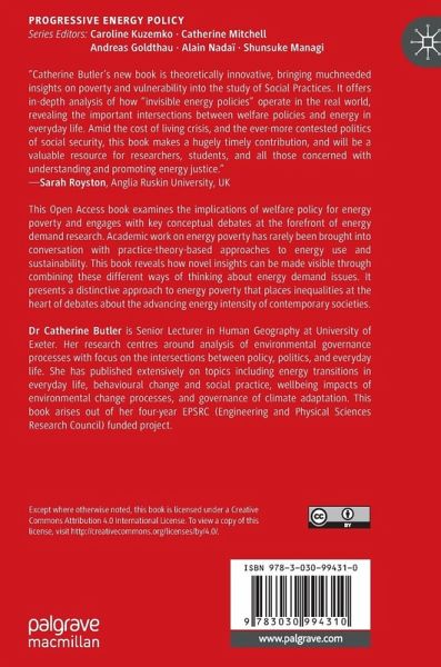 This Open Access book examines the implications of welfare policy for energy poverty and engages with key conceptual debates at the forefront of energy demand research. Academic work on energy poverty has rarely been brought into conversation with practice-theory-based approaches to energy use and sustainability. This book reveals how novel insights can be made visible through combining these different ways of thinking about energy demand issues. It presents a distinctive approach to energy poverty that places inequalities at the heart of debates about the advancing energy intensity of contemporary societies.