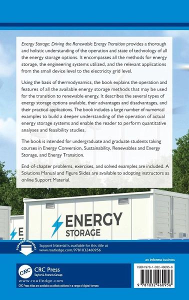Using the basis of thermodynamics, the book explains the operation and features of all the available energy storage methods that may be used for the transition to renewable energy. It describes the several types of energy storage options available, their advantages and disadvantages, and their practical applications. The book includes a large number of numerical examples to build a deeper understanding of the operation of actual energy storage systems and enable the reader to perform quantitative analyses and feasibility studies.