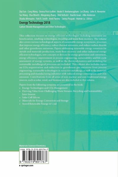 This collection focuses on energy efficient technologies including innovative ore beneficiation, smelting technologies, recycling and waste heat recovery. The volume also covers various technological aspects of sustainable energy ecosystems, processes that improve energy efficiency, reduce thermal emissions, and reduce carbon dioxide and other greenhouse emissions. Papers addressing renewable energy resources for metals and materials production, waste heat recovery and other industrial energy efficient technologies, new concepts or devices for energy generation and conversion, energy efficiency improvement in process engineering, sustainability and life cycle assessment of energy systems, as well as the thermodynamics and modeling for sustainable metallurgical processes are included. This volume also includes topics on CO2 sequestration and reduction in greenhouse gas emissions from process engineering, sustainable technologies in extractive metallurgy, as well as the materials processing and manufacturing industries with reduced energy consumption and CO2 emission. Contributions from all areas of non-nuclear and non-traditional energy sources, such as solar, wind, and biomass are also included in this volume.Papers from the following symposia are presented in the book:Energy Technologies and CO2 ManagementAdvanced Materials for Energy Conversion and Storage Deriving Value from Challenging Waste Streams: Recycling and Sustainability Joint SessionSolar Cell SiliconStored Renewable Energy in Coal