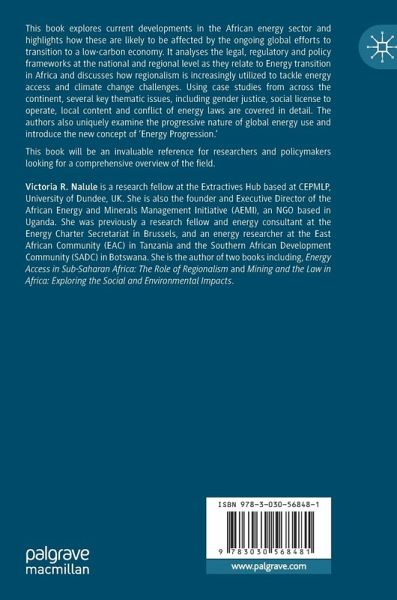 Chapter 1. Introduction; Victoria R. Nalule.- Chapter 2. African Energy Challenges in the Transition Era: The Role of Regional Cooperation; Macdonald Irowarisima.- Chapter 3. Energy Transition in Africa: Context, Barriers and Strategies; Noreen Kidunduhu.- Chapter 4. Nuclear Energy & Energy Transitions: Prospects, Challenges and Safeguards in Sub-Saharan Africa; Susan Nakanwagi.- Chapter 5. Role Of Law in the Energy Transitions in Africa: Case Study of Nigeria's Electricity Laws and Off-Grid Renewable Energy Development; Michael Uche Ukponu, Yusuf Sulayman, Kester Oyibo.- Chapter 6. The Status and Future of Charcoal in The Energy Transition Era in Sub-Saharan Africa: Observations From Uganda; Victoria R. Nalule.- Chapter 7. Will a Transition to Renewable Energy Promote Energy Security Amid Energy Crisis in Nigeria?; Cosmos Nike Nwedu.- Chapter 8. Renewable Energy Development in Egypt and Transitioning to a Low Carbon Economy; Mostafa Elshazly.- Chapter 9. Transitioning to a Low Carbon Economy and Renewable Energy Developments in Uganda: Challenges and Opportunities for Small-Scale Renewable Energy; Marvin Tumusiime.- Chapter 10. Local Content Policies in the Energy Transition Era in Africa: A Case Study of the East African Oil and Gas Industry; Rukonge Muhongo.- Chapter 11. Social Licence to Operate in the Energy Transition Era: Case Study of the East African Oil and Gas Sector; Wairimu Karanja, Nduta Njenga.- Chapter 12. Gender Justice in the Energy Transition Era: Exploring Gender and Technology in the Extractives Sector; Alaka Lugonzo, Kennedy Chege.- Chapter 13. A Critical Intertemporal Analysis of Uganda's Fiscal Regime in the Energy Transition Era: Are Uganda's Upstream Projects Still Viable?; Ayebare Tom Rukundo.