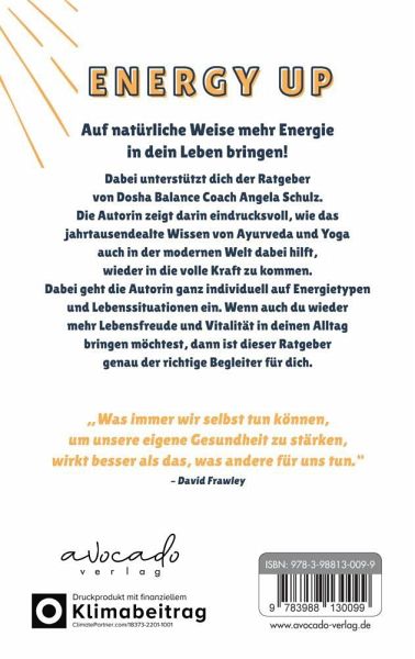 Energy Up!Auf natürliche Weise mehr Energie in dein Leben bringen. Dabei unterstützt dich dieser Ratgeber von Dosha Balance Coach Angela Schulz. Die Autorin zeigt darin eindrucksvoll, wie das Jahrtausende alte Wissen von Ayurveda und Yoga auch in der modernen Welt dabei hilft, wieder in die volle Kraft zu kommen. Dabei geht die Autorin ganz individuell auf Energietypen und Lebenssituationen ein. Wenn auch du wieder mehr Lebensfreude und Vitalität in deinen Alltag bringen möchtest, dann ist dieser Ratgeber genau der richtige Begleiter für dich."Was immer wir selbst tun können, um unsere eigene Gesundheit zu stärken,wirkt besser als das, was andere für uns tun."- David Frawley