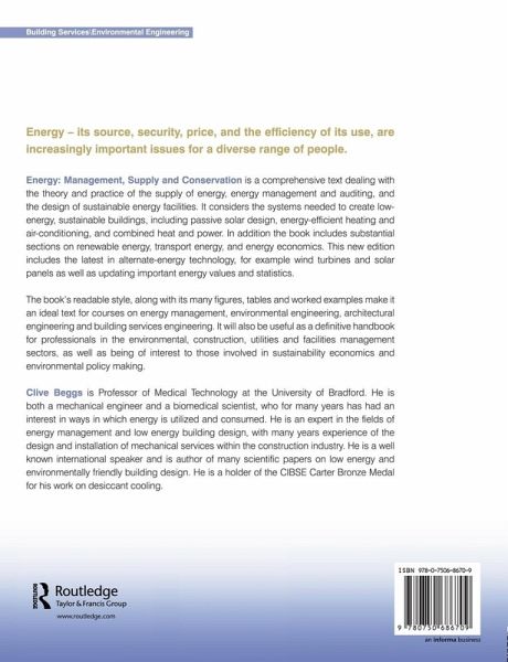 Energy - its source, security, price, and the efficiency of its use, are increasingly important issues for a diverse range of people. Energy: Management, Supply and Conservation is a comprehensive text dealing with the theory and practice of the supply of energy, energy management and auditing, and the design of sustainable energy facilities. It considers the systems needed to create low-energy, sustainable buildings, including passive solar design, energy-efficient heating and air-conditioning, and combined heat and power. In addition the book includes substantial sections on renewable energy, transport energy, and energy economics. This new edition includes the latest in alternate-energy technology, for example wind turbines and solar panels as well as updating important energy values and statistics. The book's readable style, along with its many figures, tables and worked examples make it an ideal text for courses on energy management, environmental engineering, architectural engineering and building services engineering. It will also be useful as a definitive handbook for professionals in the environmental, construction, utilities and facilities management sectors, as well as being of interest to those involved in sustainability economics and environmental policy making.