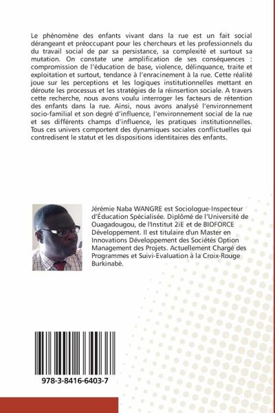 Le phénomène des enfants vivant dans la rue est un fait social dérangeant et préoccupant pour les chercheurs et les professionnels du du travail social de par sa persistance, sa complexité et surtout sa mutation. On constate une amplification de ses conséquences : compromission de l'éducation de base, violence, délinquance, traite et exploitation et surtout, tendance à l'enracinement à la rue. Cette réalité joue sur les perceptions et les logiques institutionnelles mettant en déroute les processus et les stratégies de la réinsertion sociale. A travers cette recherche, nous avons voulu interroger les facteurs de rétention des enfants dans la rue. Ainsi, nous avons analysé l'environnement socio-familial et son degré d'influence, l'environnement social de la rue et ses différents champs d'influence, les pratiques institutionnelles. Tous ces univers comportent des dynamiques sociales conflictuelles qui contredisent le statut et les dispositions identitaires des enfants.