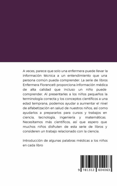 A veces, parece que solo una enfermera puede llevar la información técnica a un entendimiento que una persona común pueda comprender. La serie de libros Enfermera Florence® proporciona información médica de alta calidad que incluso un niño puede comprender. Al presentarles a los niños pequeños la terminología correcta y los conceptos científicos a una edad temprana, podemos ayudar a aumentar el nivel de alfabetización en salud de nuestros niños, así como ayudarlos a prepararlos para cursos y trabajos en ciencia, tecnología, ingeniería y matemáticas. Necesitamos más científicos, así que espero que muchos niños disfruten de esta serie de libros y consideren un trabajo relacionado con la ciencia. Introducción de algunas palabras médicas a los niños en cada libro