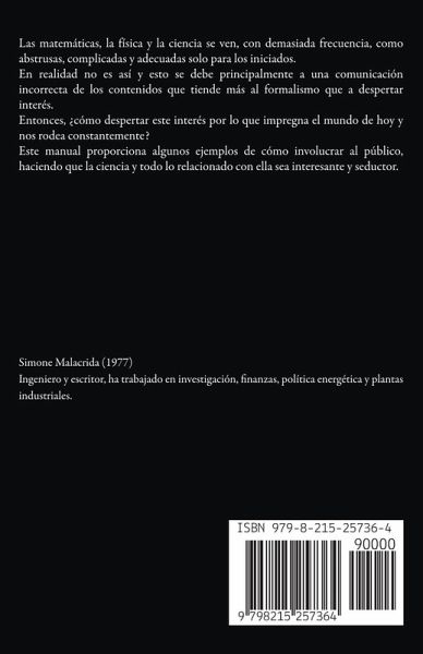 Las matemáticas, la física y la ciencia se ven, con demasiada frecuencia, como abstrusas, complicadas y adecuadas solo para los iniciados. En realidad no es así y esto se debe principalmente a una comunicación incorrecta de los contenidos que tiende más al formalismo que a despertar interés. Entonces, ¿cómo despertar este interés por lo que impregna el mundo de hoy y nos rodea constantemente? Este manual proporciona algunos ejemplos de cómo involucrar al público, haciendo que la ciencia y todo lo relacionado con ella sea interesante y seductor.