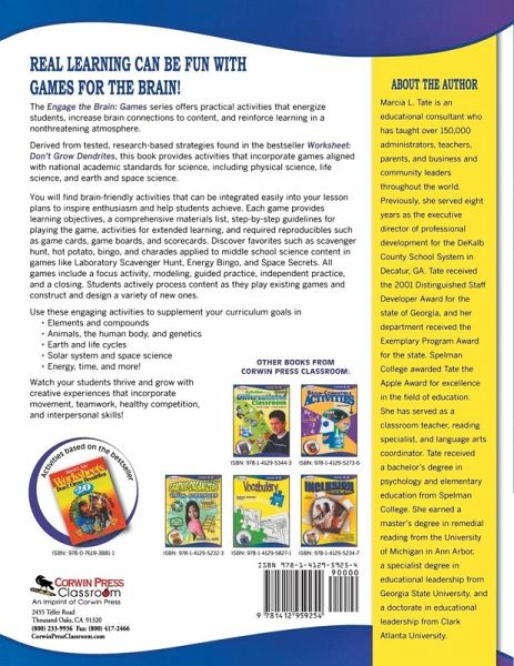 Marcia L. Tate, EdD, is the former executive director of professional development for the DeKalb County School System in Decatur, Georgia. During her thirty-year career with the district, she has been a classroom teacher, reading specialist, language arts coordinator, and staff development executive director. Marcia is currently an educational consultant and has taught over 500,000 administrators, teachers, parents, and business and community leaders throughout the world. She is the author of the eight books in the best-selling Worksheets Don't Grow Dendrites series and four additional books: Formative Assessment in a Brain-Compatible Classroom: How Do We Really Know They're Learning?, 100 Brain-Friendly Lessons for Unforgettable Teaching and Learning K-8, and 100 Brain-Friendly Lessons for Unforgettable Teaching and Learning 9-12, and her latest book, Healthy Teachers, Happy Classrooms that is designed to address both the personal and professional lives of all educators. Participants in her workshops refer to them as some of the best ones they have ever experienced since Marcia uses the twenty strategies outlined in her books to actively engage her audiences. Marcia received her bachelor's degree in psychology and elementary education from Spelman College in Atlanta, Georgia. She earned her master's degree in remedial reading from the University of Michigan in Ann Arbor, her specialist degree in educational leadership from Georgia State University, and her doctorate in educational leadership from Clark Atlanta University. Marcia is married to Tyrone Tate and is the proud mother of three children: Jennifer, Jessica, and Christopher, and nine grandchildren: Christian, Aidan, Maxwell, Aaron, Roman, Shiloh, Aya, Noah, and Alyssa. Marcia and her husband own the company Developing Minds, Inc. and can be contacted by calling the company at (770) 918-5039, emailing her at marciata@ bellsouth.net, or by visiting her website at www.developingmindsinc.com. You can also follow her on Twitter and Instagram at @DrMarciaTate.