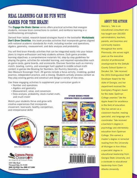 About the Engage the Brain SeriesThis practical resource gives teachers the tools they need to plan lessons correlated to the way the brain learns best. Based on tested, research-based strategies presented in Worksheets Don't Grow Dendrites: 20 Instructional Strategies That Engage the Brain, this book offers a variety of language arts activities that incorporate games to help students make sense of and reinforce learning. These activities give students the opportunity to not only play but also construct and design a variety of games, greatly increasing brain connections to the content. These strategies allow students to master curriculum objectives while actively rehearse information in an engaging, non-threatening atmosphere, which makes a real difference in students' energy, motivation, and achievement.Engage the Brain: Games, Math, Grades 6-8 contains games based on national academic standards for math, including numbers and operations, algebra, geometry, measurement, and data analysis and probability. Some games are based on old favorites (Wheel of Fortune, Bowling, Rummy, Battleship, Scrabble, Concentration, Scavenger Hunt, Jeopardy, Baseball) and some are brand new, including:Last Number StandingTarget ZeroBowling for NumbersMath in the MallValue of the VariableColor Wheel RaceOutdoor AlgebraPolynomial ShuffleAlgebraic ScrabblePolygon TwisterGin Rummy GeometryCoordinate BattleshipConversion ConcentrationGeo-Measure Scavenger HuntOut on a LimbMath BaseballMath JeopardyStock Market MathEach game includes one or more learning objectives, a comprehensive materials list, step-by-step information for the teacher on how to prepare for and play the game, any necessary reproducibles (such as game cards, game boards, scorecards), and follow-up activities for extended learning. The games are presented in the brain-friendly lesson formation, including a focus activity, modeling, guided practice, independent practice, and closing.
