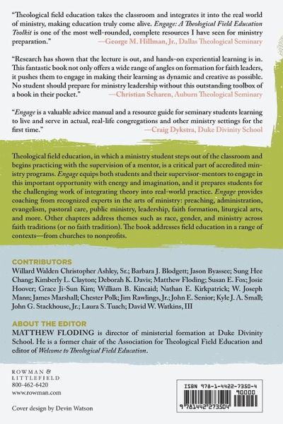 Foreword Lucinda Huffaker Acknowledgments Introduction Matthew Floding 1 Engaging Theological Field Education Matthew Floding 2 Engaging with Your Supervisor-Mentor Matthew Floding 3 Engaging with Your Field Education Student Matthew Floding 4 Engaging Your Context for Ministry William B. Kincaid 5 Engaging in Ministry Ethically Barbara J. Blodgett 6 Engaging in Theological Reflection Matthew Floding 7 Engaging in Sustaining Spiritual Practices Deborah K. Davis 8 Engaging in Personal Self-Care James Marshall 9 Engaging in Preaching Jason Byassee 10 Engaging the Liturgical Arts Josie Hoover 11 Engaging in Pastoral Care Willard Walden Christopher Ashley Sr. 12 Engaging in Evangelism John G. Stackhouse Jr. 13 Engaging in Faith Formation Sung Hee Chang 14 Engaging in Church Administration W. Joseph Mann 15 Engaging for Faithful Leadership Kyle J. A. Small 16 Engaging in Public Ministry David W. Watkins III 17 Engaging Learning Across Generations Nathan E. Kirkpatrick 18 Engaging as a Gendered Person Kimberly L. Clayton 19 Engaging Race Grace Ji-Sun Kim 20 Engaging in a Nonprofit Context John E. Senior 21 Engaging in Clinical Pastoral Education Jim Rawlings Jr. 22 Engaging Technology in Field Education Susan E. Fox 23 Engaging Ministry in Secular Settings Laura S. Tuach 24 Engaging in an International Field Education Chester Polk Notes About the Contributors