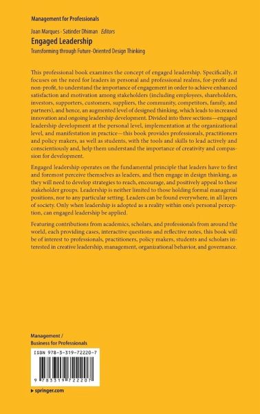 This professional book examines the concept of engaged leadership. Specifically, it focuses on the need for leaders in personal and professional realms, for-profit and non-profit, to understand the importance of engagement in order to achieve enhanced satisfaction and motivation among stakeholders (including employees, shareholders, investors, supporters, customers, suppliers, the community, competitors, family, and partners), and hence, an augmented level of designed thinking, which leads to increased innovation and on-going leadership development. Divided into three sections-engaged leadership development at the personal level, implementation at the organizational level, and manifestation in practice-this book provides professionals, practitioners and policy makers as well as students with the tools and skills to lead actively and conscientiously and help them understand the importance of creativity and compassion for development.