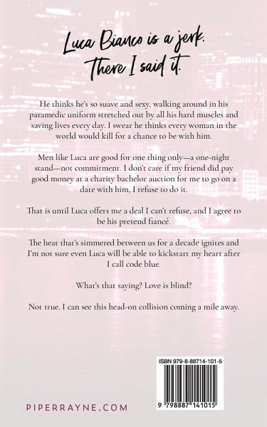 A Sexy FAKE RELATIONSHIP rom com standalone written by a duo of two USA Bestselling Authors Luca Bianco is a jerk. There I said it. He thinks he's so suave and sexy, walking around in his paramedic uniform stretched out by all his hard muscles and saving lives every day. I swear he thinks every woman in the world would kill for a chance to be with him. Men like Luca are good for one thing only-a one-night stand-not commitment. I don't care if my friend did pay good money at a charity bachelor auction for me to go on a date with him, I refuse to do it. That is until Luca offers me a deal I can't refuse, and I agree to be his pretend fiancé. The heat that's simmered between us for a decade ignites and I'm not sure even Luca will be able to kickstart my heart after I call code blue. What's that saying? Love is blind? Not true. I can see this head-on collision coming a mile away.