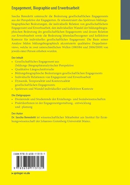 Sascha Benedetti untersucht die Bedeutung gesellschaftlichen Engagements aus der Perspektive der Engagierten. Er rekonstruiert das Spektrum bildungsbiographischer Bedeutungen, die individuelle Relation von gesellschaftlichem Engagement und Erwerbsarbeit, den individuellen Wandel der bildungsbiographischen Bedeutung des gesellschaftlichen Engagements und dessen Relation zur Erwerbsarbeit sowie die Bedeutung lebenslaufbezogener und kollektiver Kontexte für individuelles gesellschaftliches Engagement. Die Basis seiner Analyse bilden bildungsbiographisch akzentuierte qualitative Doppelinterviews, welche in zwei unterschiedlichen Wellen (1983/84 und 2006/2009) von jeweils einer Person erhoben wurden.