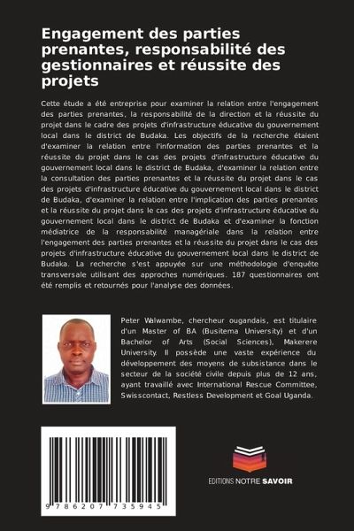 Cette étude a été entreprise pour examiner la relation entre l'engagement des parties prenantes, la responsabilité de la direction et la réussite du projet dans le cadre des projets d'infrastructure éducative du gouvernement local dans le district de Budaka. Les objectifs de la recherche étaient d'examiner la relation entre l'information des parties prenantes et la réussite du projet dans le cas des projets d'infrastructure éducative du gouvernement local dans le district de Budaka, d'examiner la relation entre la consultation des parties prenantes et la réussite du projet dans le cas des projets d'infrastructure éducative du gouvernement local dans le district de Budaka, d'examiner la relation entre l'implication des parties prenantes et la réussite du projet dans le cas des projets d'infrastructure éducative du gouvernement local dans le district de Budaka et d'examiner la fonction médiatrice de la responsabilité managériale dans la relation entre l'engagement des parties prenantes et la réussite du projet dans le cas des projets d'infrastructure éducative du gouvernement local dans le district de Budaka. La recherche s'est appuyée sur une méthodologie d'enquête transversale utilisant des approches numériques. 187 questionnaires ont été remplis et retournés pour l'analyse des données.