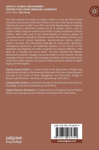 This book examines the nature of conflict in Africa vis-à-vis the African Union (AU) peace and security architecture in Africa. It focuses on the intense campaign 'Silencing the Guns by 2020' since 2013, one of the flagship projects of Agenda 2063 to achieve a conflict-free continent by AU. It analyses various causes of conflict in Africa using case studies to pursue the causality and dynamics of these conflicts, which often point to the intersectionality of historical legacies of colonialism and neo-colonialism. It further examines the interplay of factors such as resource curse, resource exploitation, election-induced violence, political violence, incessant and interminable challenges of social justice, oppression, contemporary governance, and leadership dynamics. It also focuses on the application and integration of conflict and gender for analytical reflection. In the quest for a "Peaceful and secure Africa", this book examines the different mechanisms to prevent, manage,and resolve conflicts on the continent, and the challenges thereof. It probes and investigates by asking critical questions about continental conflict dynamics and peace architectures which warrants in-depth inquiry and interrogation.