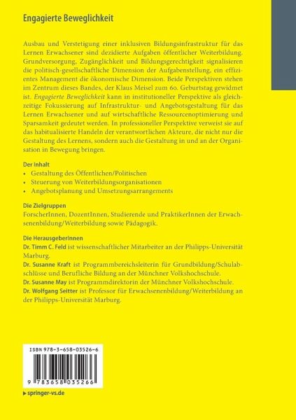 Ausbau und Verstetigung einer inklusiven Bildungsinfrastruktur für das Lernen Erwachsener sind dezidierte Aufgaben öffentlicher Weiterbildung.Grundversorgung, Zugänglichkeit und Bildungsgerechtigkeit signalisieren die politisch-gesellschaftliche Dimension der Aufgabenstellung, ein effizientes Management die ökonomische Dimension. Beide Perspektiven stehen im Zentrum dieses Bandes, der Klaus Meisel zum 60. Geburtstag gewidmet ist. Engagierte Beweglichkeit kann in institutioneller Perspektive als gleichzeitige Fokussierung auf Infrastruktur- und Angebotsgestaltung für das Lernen Erwachsener und auf wirtschaftlicheRessourcenoptimierung und Sparsamkeit gedeutet werden. In professioneller Perspektive verweist sie auf das habitualisierte Handeln der verantwortlichen Akteure, die nicht nur die Gestaltung des Lernens, sondern auch die Gestaltung in und an der Organisation in Bewegung bringen.