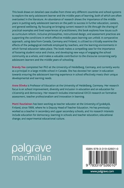 This book draws on detailed case studies from three very different countries and school systems to explore the early adolescent learner and the middle years of learning, both of which are often overlooked in the literature. An abundance of research shows the importance of the middle years in putting early adolescent learners on the path to success in further education, careers, and general wellbeing. By focusing on bringing current research to life through the sharing of practical examples and lived experiences of practitioners, this book explores how issues such as curriculum reform, inclusive philosophies, instructional design, and assessment practices are supporting the conditions in which effective middle years learning can unfold. A comparative approach, using data from Canada, Germany and Finland, is utilized to critically examine the effects of the pedagogical methods employed by teachers, and the learning environments in which formal education takes place. The book makes a compelling case for the importance of fostering student voice and choice, and developing new ways of engaging the school community as a whole, and makes a valuable contribution to the discourse concerning early adolescent learners and the middle years of schooling.