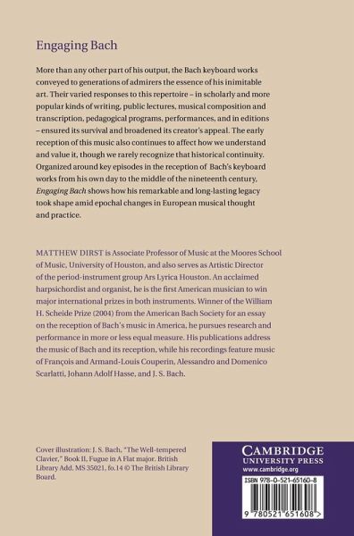 More than any other part of Bach's output, his keyboard works conveyed the essence of his inimitable art to generations of admirers. The varied responses to this repertory - in scholarly and popular writing, public lectures, musical composition and transcription, performances and editions - ensured its place in the canon and broadened its creator's appeal. The early reception of Bach's keyboard music also continues to affect how we understand and value it, though we rarely recognize that historical continuity. Here, Matthew Dirst investigates how Bach's music intersects with cultural, social and music history, focusing on a repertory which is often overshadowed in scholarly and popular literature on Bach reception. Organized around the most productive ideas generated by Bach's keyboard works from his own day to the middle of the nineteenth century, this study shows how Bach's remarkable and long-lasting legacy took shape amid critical changes in European musical thought and practice.