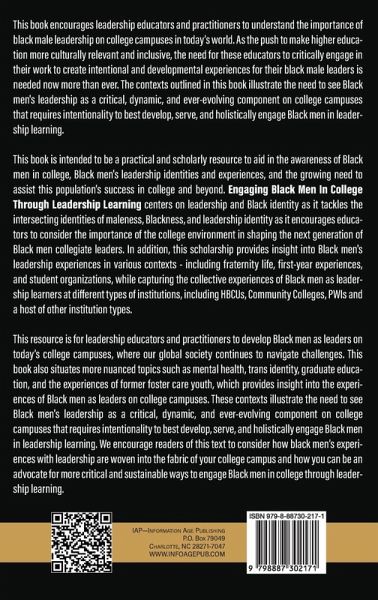 This book encourages leadership educators and practitioners to understand the importance of black male leadership on college campuses in today's world. As the push to make higher education more culturally relevant and inclusive, the need for these educators to critically engage in their work to create intentional and developmental experiences for their black male leaders is needed now more than ever. The contexts outlined in this book illustrate the need to see Black men's leadership as a critical, dynamic, and ever-evolving component on college campuses that requires intentionality to best develop, serve, and holistically engage Black men in leadership learning. This book is intended to be a practical and scholarly resource to aid in the awareness of Black men in college, Black men's leadership identities and experiences, and the growing need to assist this population's success in college and beyond. Engaging Black Men In College Through Leadership Learning centers on leadership and Black identity as it tackles the intersecting identities of maleness, Blackness, and leadership identity as it encourages educators to consider the importance of the college environment in shaping the next generation of Black men collegiate leaders. In addition, this scholarship provides insight into Black men's leadership experiences in various contexts - including fraternity life, first-year experiences, and student organizations, while capturing the collective experiences of Black men as leadership learners at different types of institutions, including HBCUs, Community Colleges, PWIs and a host of other institution types. This resource is for leadership educators and practitioners to develop Black men as leaders on today's college campuses, where our global society continues to navigate challenges. This book also situates more nuanced topics such as mental health, trans identity, graduate education, and the experiences of former foster care youth, which provides insight into the experiences of Black men as leaders on college campuses. These contexts illustrate the need to see Black men's leadership as a critical, dynamic, and ever-evolving component on college campuses that requires intentionality to best develop, serve, and holistically engage Black men in leadership learning. We encourage readers of this text to consider how black men's experiences with leadership are woven into the fabric of your college campus and how you can be an advocate for more critical and sustainable ways to engage Black men in college through leadership learning.