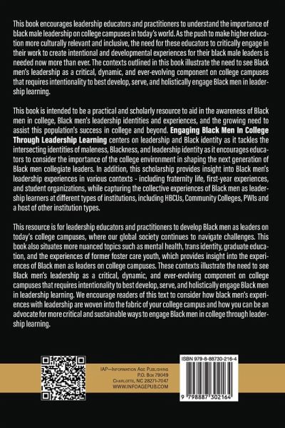 This book encourages leadership educators and practitioners to understand the importance of black male leadership on college campuses in today's world. As the push to make higher education more culturally relevant and inclusive, the need for these educators to critically engage in their work to create intentional and developmental experiences for their black male leaders is needed now more than ever. The contexts outlined in this book illustrate the need to see Black men's leadership as a critical, dynamic, and ever-evolving component on college campuses that requires intentionality to best develop, serve, and holistically engage Black men in leadership learning. This book is intended to be a practical and scholarly resource to aid in the awareness of Black men in college, Black men's leadership identities and experiences, and the growing need to assist this population's success in college and beyond. Engaging Black Men In College Through Leadership Learning centers on leadership and Black identity as it tackles the intersecting identities of maleness, Blackness, and leadership identity as it encourages educators to consider the importance of the college environment in shaping the next generation of Black men collegiate leaders. In addition, this scholarship provides insight into Black men's leadership experiences in various contexts - including fraternity life, first-year experiences, and student organizations, while capturing the collective experiences of Black men as leadership learners at different types of institutions, including HBCUs, Community Colleges, PWIs and a host of other institution types. This resource is for leadership educators and practitioners to develop Black men as leaders on today's college campuses, where our global society continues to navigate challenges. This book also situates more nuanced topics such as mental health, trans identity, graduate education, and the experiences of former foster care youth, which provides insight into the experiences of Black men as leaders on college campuses. These contexts illustrate the need to see Black men's leadership as a critical, dynamic, and ever-evolving component on college campuses that requires intentionality to best develop, serve, and holistically engage Black men in leadership learning. We encourage readers of this text to consider how black men's experiences with leadership are woven into the fabric of your college campus and how you can be an advocate for more critical and sustainable ways to engage Black men in college through leadership learning.