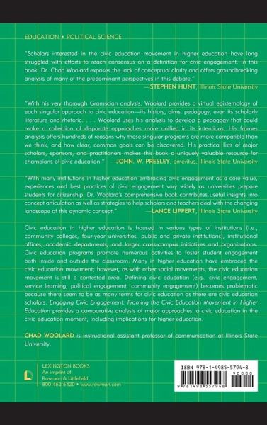 Engaging Civic Engagement: Framing the Civic Education Movement in Higher Education provides a comparative analysis of major approaches to civic education in the civic education moment, including implications for higher education.