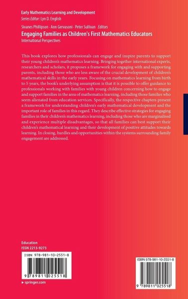 Introduction.- Chapter 1 Engaging families as the first mathematics educators of children.- Key foci and pedagogical actions that support young children's mathematics learning.- Chapter 2 Describing the mathematical intentions of early learning childhood experiences.- Chapter 3 Mathematics with infants and toddlers.- Chapter 4 Enumeration: Counting difficulties are not always related to numbers.- Chapter 5 Discerning and supporting the development of mathematical fundamentals in early years.- Chapter 6 Number stories.- Home interactions and learning experiences that support early mathematical learning.- Chapter 7 Meta-Analysis of the relationship between Home and Family experiences and Young children's early numeracy learning.- Chapter 8 Parental perceptions of access to capitals and early mathematical learning: Some early insights from Numeracy@Home project.- Chapter 9 Involving parents in games and picture books.- Chapter 10 Do Hong Kong parents engage in learning activities conducive to preschool children's mathematics development?.- Family and educator partnerships that support early mathematical learning.- Chapter 11 Working with parents to promote preschool children's numeracy: Teachers' attitudes and beliefs.- Chapter 12 Bringing families and preschool educators together to support young children's learning through noticing, exploring and talking about Mathematics.- Chapter 13 Supporting early mathematics learning: Building mathematical capital through participating in early years swimming.- Chapter 14 Fostering children's everyday mathematical knowledge through caregiver participation in Support Playgroups in Schools.- Conclusion.- Chapter 15 Insights for engaging families as the first mathematics educators of children.