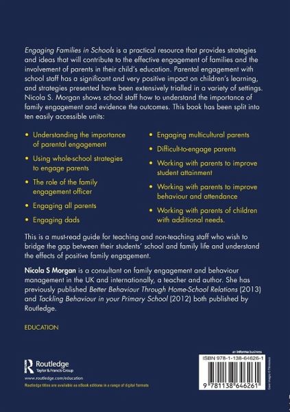 Engaging Families in Schools is a practical resource that provides strategies and ideas that will contribute to the effective engagement of families and the involvement of parents in their child's education. Parental engagement with school staff has a significant and very positive impact on children's learning, and strategies presented have been extensively trialled in a variety of different settings. Nicola S. Morgan shows school staff how to understand the importance of family engagement and evidence the outcomes. This book has been split into ten easily accessible units: Understanding the importance of parent engagement Using whole-school strategies to engage parents The role of the family engagement officer Engaging all parents Engaging Dads Engaging multicultural parents Difficult to engage parents Working with parents to improve student attainment Working with parents to improve behaviour and attendance Working with parents of children with additional needs This is a must-read guide for teaching and non teaching staff who wishes to bridge the gap between their student's school and family life and understand the effects of positive family engagement.
