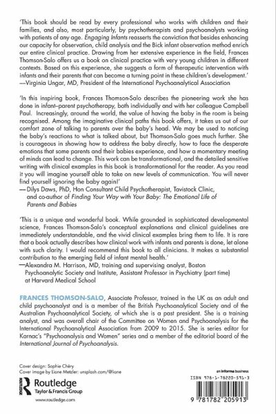 The book begins by describing, within a psychodynamic approach, some traits an infant may bring to an intervention, followed by descriptions of interventions in several specialised perinatal settings. Several chapters focus on parent-infant families who have experienced considerable anxiety and depression, and those who have experienced trauma and lived borderline experiences or of mental illness. An innovative intervention which successfully engaged young parents and their infants so that most of them felt they could understand and relate to their newborn infant is next outlined. Turning to most parents of an infant in a neonatal intensive care unit who feel traumatised which may impact on the emotional relationship with their infants, there is often a need for psychodynamic exploration before these difficulties can be modulated. With such interventions the staff become more containing and may more likely seek an intervention for a premature infant in their own right, attuned to the meaning of his or her mood and behaviour. Infant-parent therapy in paediatric contexts, infants in groups, and relating to infant and parents in the context of family violence are briefly described.