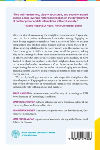 Transnational perspectives on the relationship between nuclear energy and society. With the aim of overcoming the disciplinary and national fragmentation that characterizes much research on nuclear energy, Engaging the Atom brings together specialists from a variety of fields to analyze comparative case studies across Europe and the United States. It explores evolving relationships between society and the nuclear sector from the origins of civilian nuclear power until the present, asking why nuclear energy has been more contentious in some countries than in others and why some countries have never gone nuclear, or have decided to phase out nuclear, while their neighbors have committed to the so-called nuclear renaissance. Contributors examine the challenges facing the nuclear sector in the context of aging reactor fleets, pressing climate urgency, and increasing competition from renewable energy sources. Written by leading academics in their respective disciplines, the nine chapters of Engaging the Atom place the evolution of nuclear energy within a broader set of national and international configurations, including its role within policies and markets.