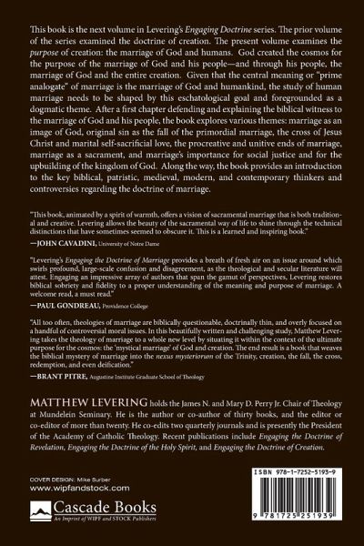 This book is the next volume in Levering's Engaging Doctrine series. The prior volume of the series examined the doctrine of creation. The present volume examines the purpose of creation: the marriage of God and humans. God created the cosmos for the purpose of the marriage of God and his people--and through his people, the marriage of God and the entire creation. Given that the central meaning or "prime analogate" of marriage is the marriage of God and humankind, the study of human marriage needs to be shaped by this eschatological goal and foregrounded as a dogmatic theme. After a first chapter defending and explaining the biblical witness to the marriage of God and his people, the book explores various themes: marriage as an image of God, original sin as the fall of the primordial marriage, the cross of Jesus Christ and marital self-sacrificial love, the procreative and unitive ends of marriage, marriage as a sacrament, and marriage's importance for social justice and for the upbuilding of the kingdom of God. Along the way, the book provides an introduction to the key biblical, patristic, medieval, modern, and contemporary thinkers and controversies regarding the doctrine of marriage.