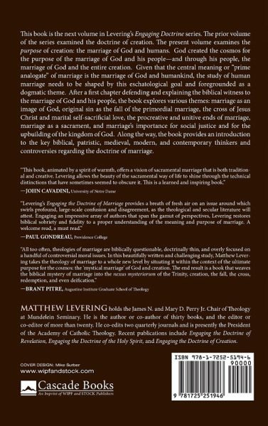 This book is the next volume in Levering's Engaging Doctrine series. The prior volume of the series examined the doctrine of creation. The present volume examines the purpose of creation: the marriage of God and humans. God created the cosmos for the purpose of the marriage of God and his people--and through his people, the marriage of God and the entire creation. Given that the central meaning or "prime analogate" of marriage is the marriage of God and humankind, the study of human marriage needs to be shaped by this eschatological goal and foregrounded as a dogmatic theme. After a first chapter defending and explaining the biblical witness to the marriage of God and his people, the book explores various themes: marriage as an image of God, original sin as the fall of the primordial marriage, the cross of Jesus Christ and marital self-sacrificial love, the procreative and unitive ends of marriage, marriage as a sacrament, and marriage's importance for social justice and for the upbuilding of the kingdom of God. Along the way, the book provides an introduction to the key biblical, patristic, medieval, modern, and contemporary thinkers and controversies regarding the doctrine of marriage.