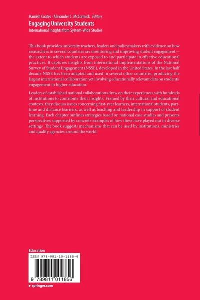 1) Student engagement as a window into undergraduate education.- 2) Refocusing the quality discourse: The United States National Survey of Student Engagement.- 3) A Canadian perspective on student engagement.- 4) Engaging university students in Australia.- 5) The New Zealand Experience.- 6) Student engagement in South Africa: A key to success, quality and development.- 7) Engaging students in China.- 8)The collaborative development and implementation of the Irish Survey of Student Engagement.- 9) Role-based insights into enhancing student engagement.- 10) Broader strategies for developing student engagement.- 11) Emerging trends and perspectives.