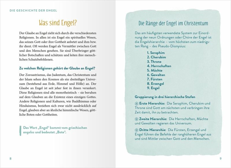 Es gibt viele Engel, die über uns wachen und uns beschützen. Dieses Buch im Handtaschenformat lädt ein auf eine Reise in die spirituelle Welt der Engel in all ihren Formen. Informative Texte zur Geschichte der Engel, welche es gibt, was sie bewirken und wie wir uns mit ihnen verbinden können kombiniert mit kleinen Zitaten und spirituellen Fotografien geben einen guten Überblick und schenken Inspiration und Freude. Mit der Weisheit und Führung der Engel findet jeder seine Bestimmung und das Positive im Leben.