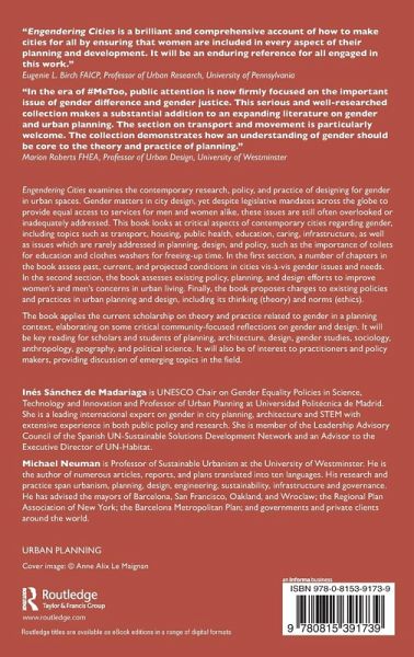 Engendering Cities examines the contemporary research, policy, and practice of designing for gender in urban spaces. Gender matters in city design, yet despite legislative mandates across the globe to provide equal access to services for men and women alike, these issues are still often overlooked or inadequately addressed. This book looks at critical aspects of contemporary cities regarding gender, including topics such as transport, housing, public health, education, caring, infrastructure, as well as issues which are rarely addressed in planning, design, and policy, such as the importance of toilets for education and clothes washers for freeing-up time. In the first section, a number of chapters in the book assess past, current, and projected conditions in cities vis-à-vis gender issues and needs. In the second section, the book assesses existing policy, planning, and design efforts to improve women's and men's concerns in urban living. Finally, the book proposes changes to existing policies and practices in urban planning and design, including its thinking (theory) and norms (ethics). The book applies the current scholarship on theory and practice related to gender in a planning context, elaborating on some critical community-focused reflections on gender and design. It will be key reading for scholars and students of planning, architecture, design, gender studies, sociology, anthropology, geography, and political science. It will also be of interest to practitioners and policy makers, providing discussion of emerging topics in the field.