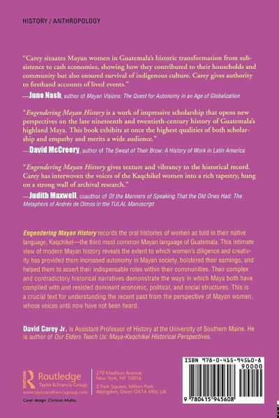 Presenting Mayan history from the perspective of Mayan women--whose voices until now have not been documented--David Carey allows these women to present their worldviews in their native language, adding a rich layer to recent Latin American historiography, and increasing our comprehension of indigenous perspectives of the past. Drawing on years of research among the Maya that specifically documents women's oral histories, Carey gives Mayan women a platform to discuss their views on education, migrant labor, work in the home, female leadership, and globalization. These oral histories present an ideal opportunity to understand indigenous women's approach to history, the apparent contradictions in gender roles in Mayan communities, and provide a distinct conceptual framework for analyzing Guatamalan, Mayan, and Latin American history.
