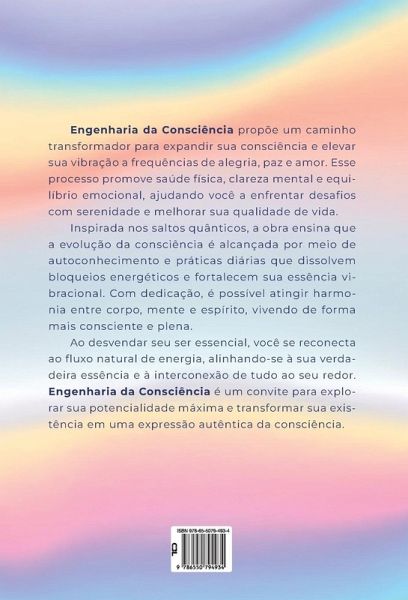 "Engenharia da Consciência propõe um caminho transformador para expandir sua consciência e elevar sua vibração a frequências de alegria, paz e amor. Esse processo promove saúde física, clareza mental e equilíbrio emocional, ajudando você a enfrentar desafios com serenidade e melhor ar sua qualidade de vida. Inspirada nos saltos quânticos, a obra ensina que a evolução da consciência é alcançada por meio de autoconhecimento e práticas diárias que dissolvem bloqueios energéticos e fortalecem sua essência vibracional. Com dedicação, é possível atingir harmonia entre corpo, mente e espírito, vivendo de forma mais c onsciente e plena. Ao desvendar seu ser essencial, você se reconecta ao fluxo natural de energia, alinhando-se à sua verdadeira essência e à interconexão de tudo ao seu redor. Engenharia da Consciência é um convite para explorar sua potencialidade máxima e transformar sua existência em uma e xpressão autêntica da consciência."